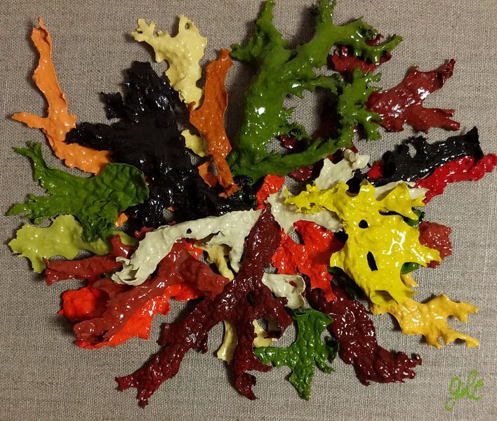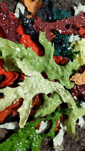 All the pieces below are made of lichen. Most people will use lichen for tea or dye, in my case it is for art. Each lichen is individually hand painted with acrylic paint one at a time then mounted on a canvas.Every piece is unique and can be replicated.